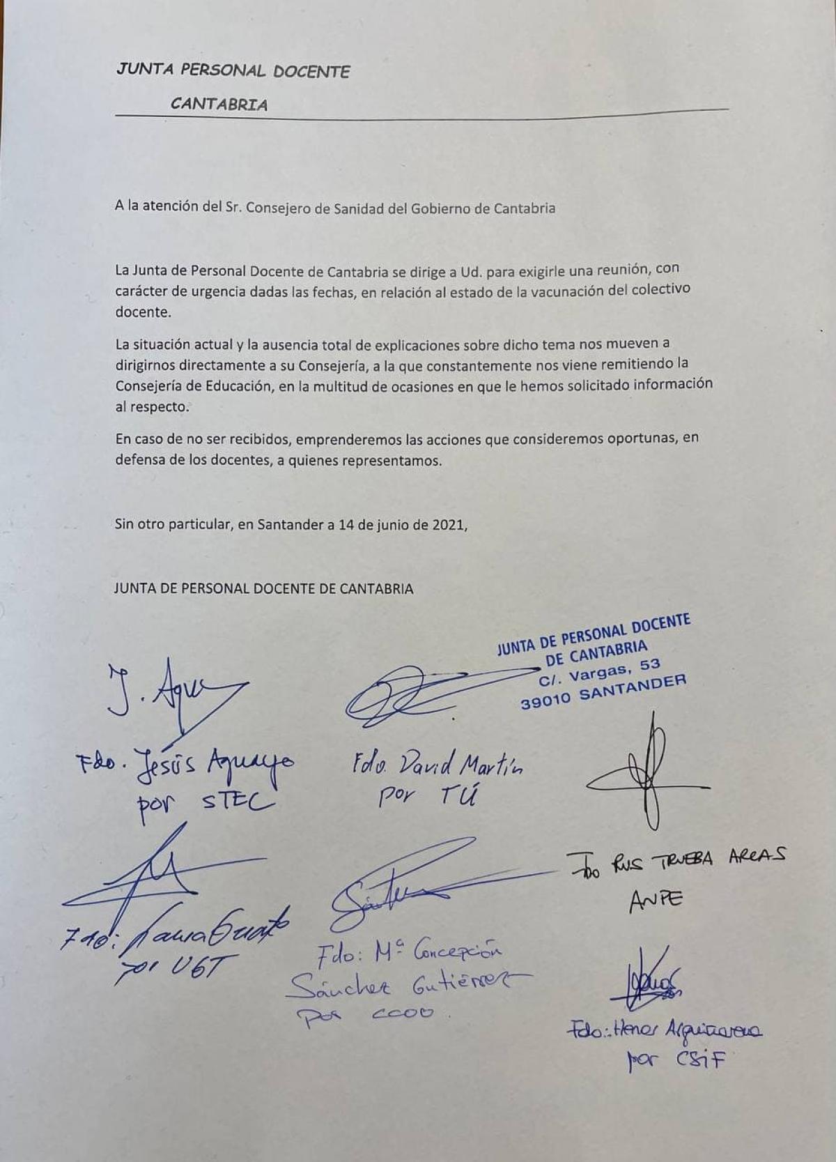 La Junta de Personal Docente de Cantabria se dirige a Ud. para exigirle una reunión, con carácter de urgencia dadas las fechas, en relación al estado de la vacunación del colectivo docente.